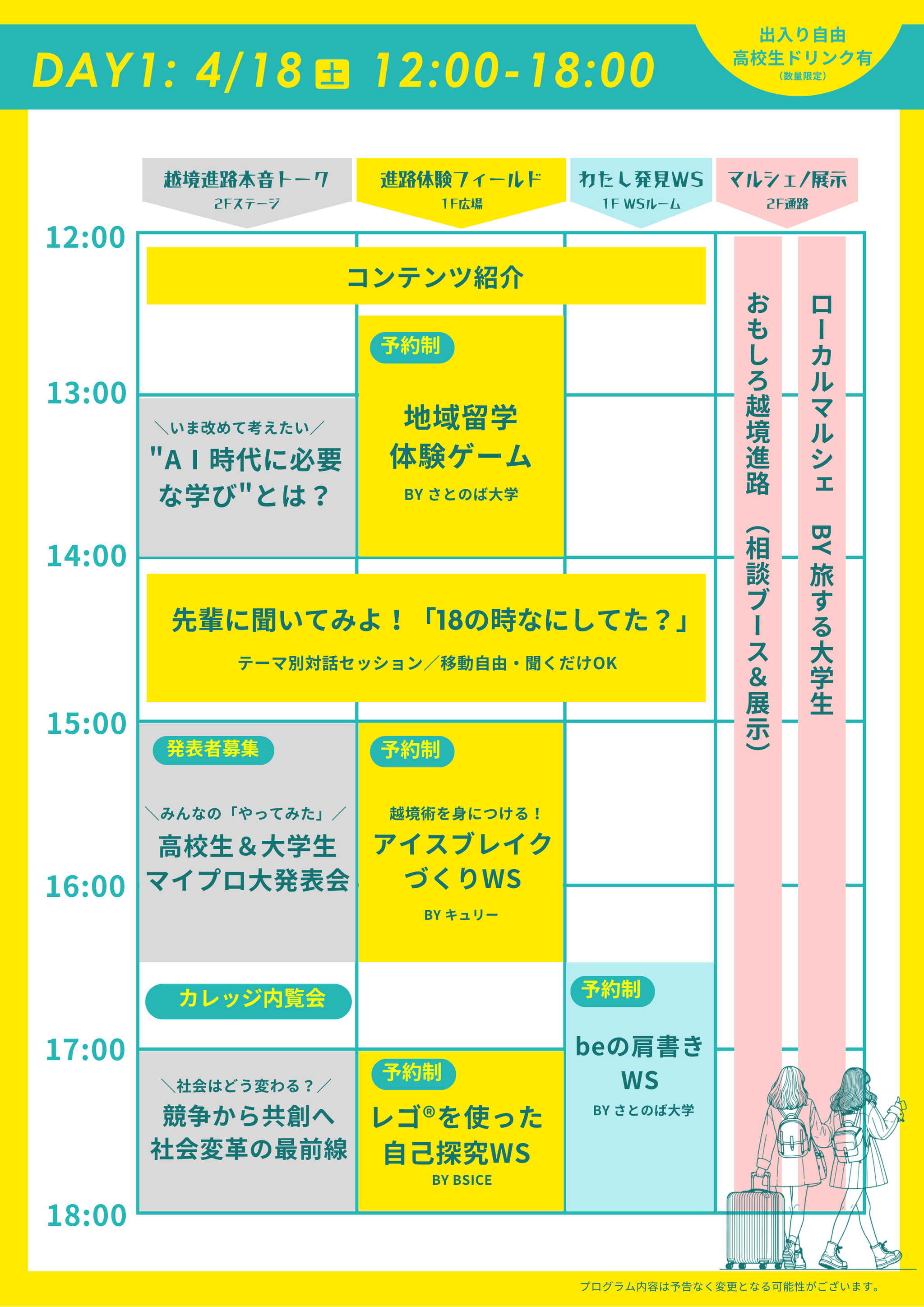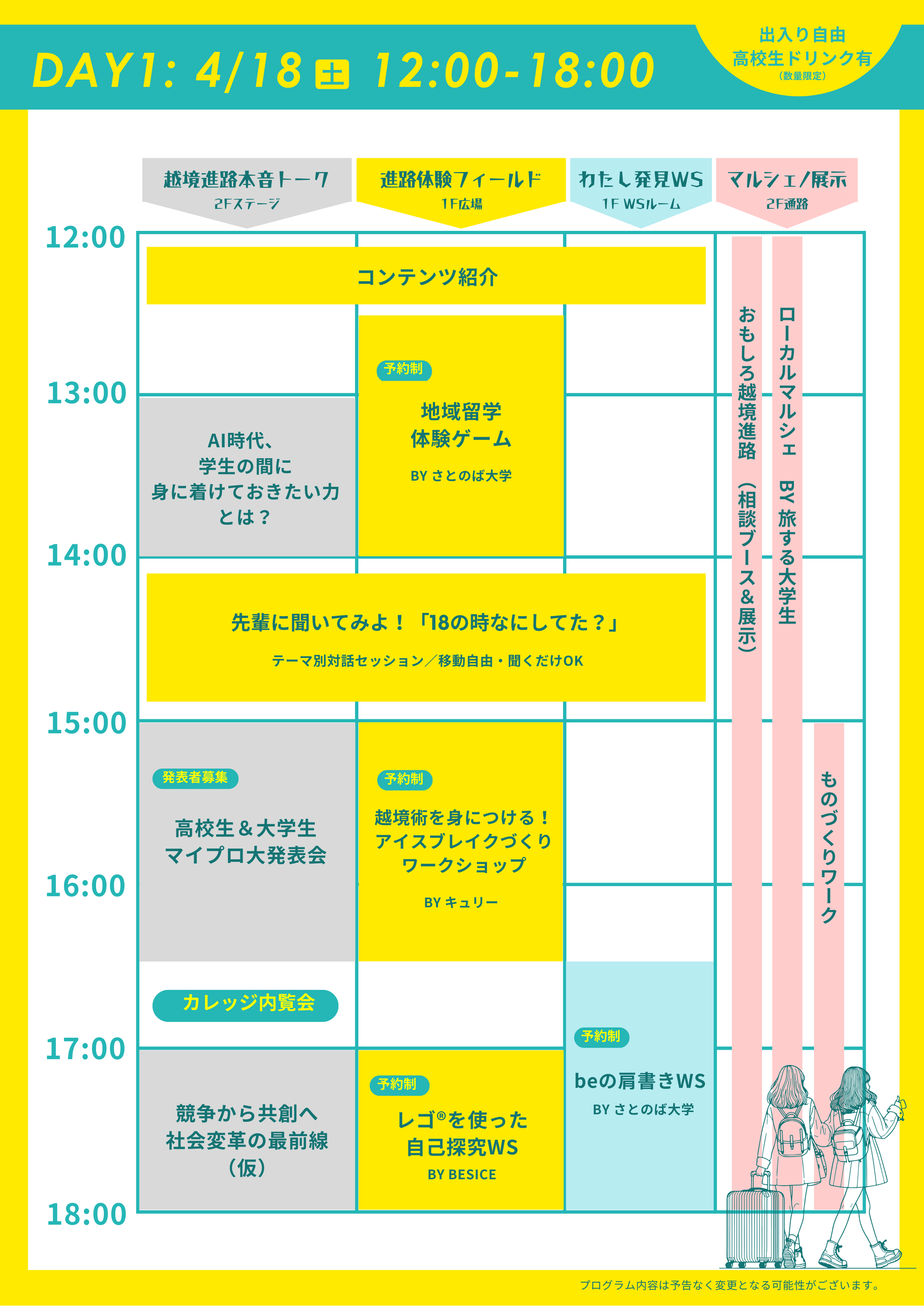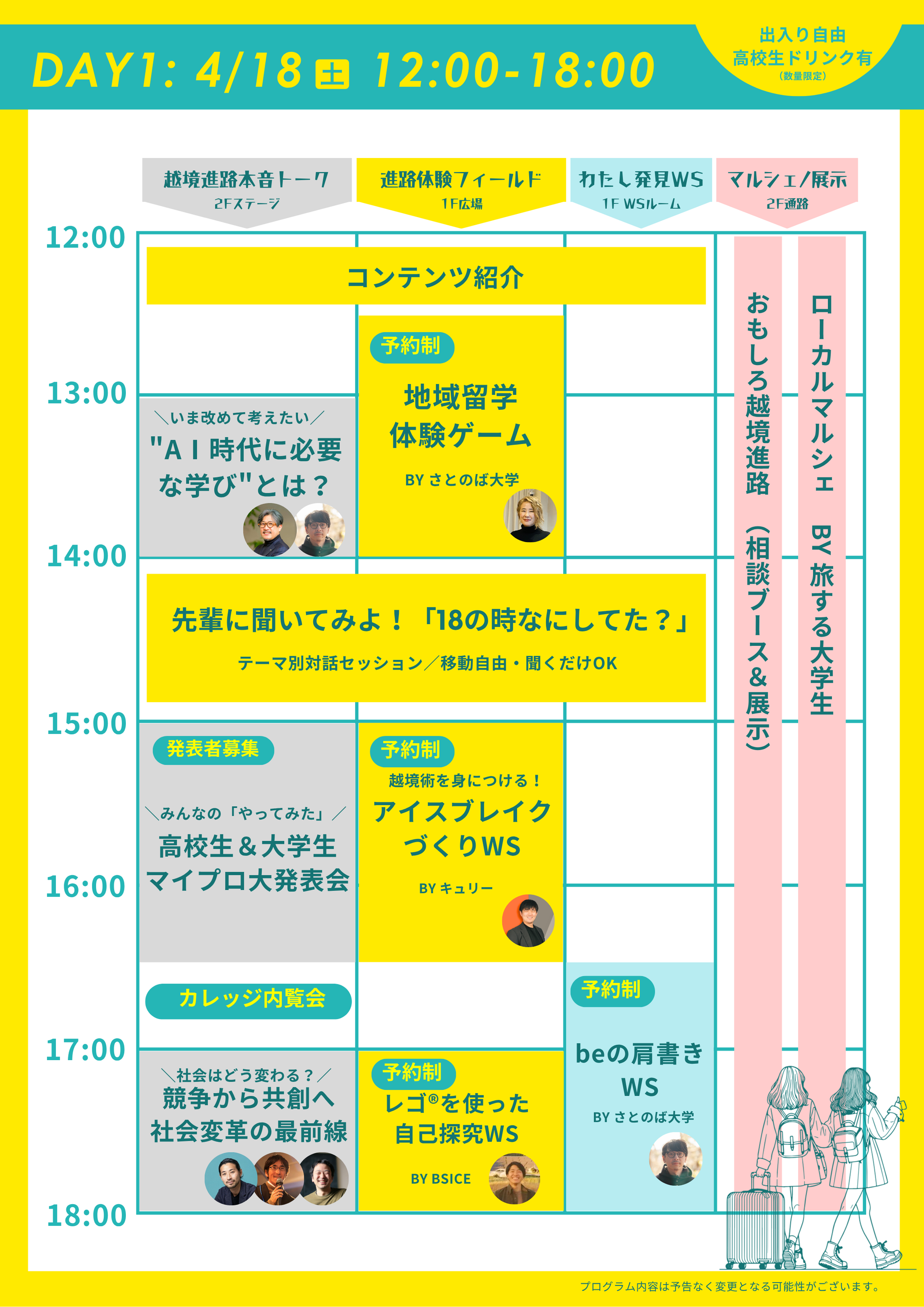 2日間の開催中、同時進行でトークやワークショップ等が行われます。文化祭のようにご自由にコンテンツを巡り楽しめる場を予定しています。