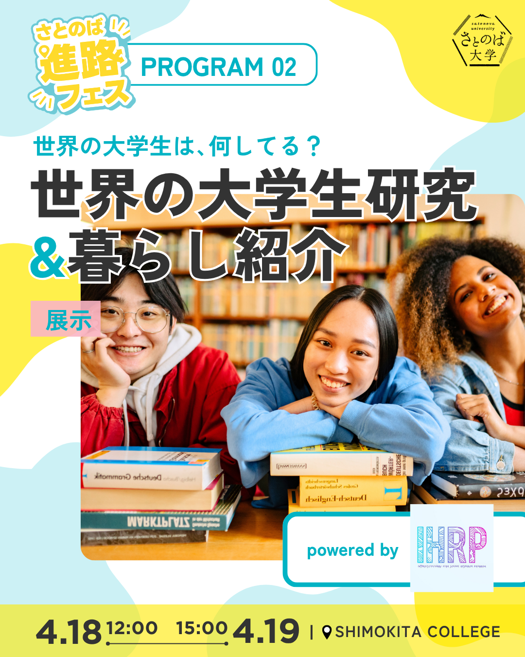 世界の大学生研究&暮らし紹介ではIHRPの運営をしている、学年も専攻も大学の所在地もさまざまな大学生たちが、自分の大学生活の好きなところや大切にしていることを写真付きで紹介します。研究や留学、課外活動、就職活動、院進の準備、友人やルームメイトとの暮らし、日々の小さな楽しみまで、大学案内だけでは伝わらない魅力をやさしくお届けし、新しい選択肢に出会える展示を目指しています。